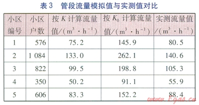 為了驗證計算得到的同時工作系數(shù)的準確性,下面分別利用同時工作系數(shù)K與K計算該地區(qū)5個小區(qū)的管段流量,并將結果與實測流量值進行對比,見表3。
