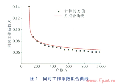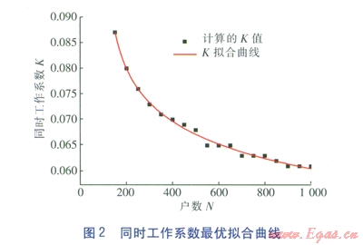 此式仍然滿足同時工作系數(shù)的一般規(guī)律,而且加冪運算使得K隨Ⅳ的變化而變化的敏感性提高。當置信區(qū)間P較小時,計算誤差對整個運算的影響逐漸減小,故而造成的波動也越來越小。針對此地區(qū)的同時工作系數(shù)在置信區(qū)間P=[0.99,1)時,將計算出來的離散數(shù)據(jù)擬合成曲線的函數(shù)關系,將表1中的數(shù)據(jù)作為依據(jù)進行擬合,得到戶數(shù)與同時工作系數(shù)的擬合結果,見圖1。