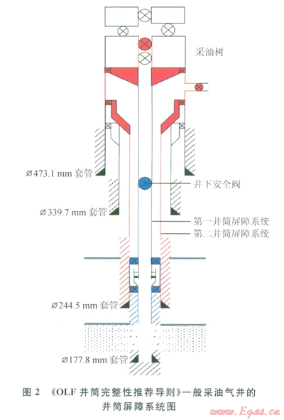 2)鑒于“深水地平線事件”教訓(xùn)和近年來環(huán)空帶壓的研究,《OLF井筒完整性推薦指南》將一般采油氣井的井筒屏障系統(tǒng)的第一安全屏障延伸到尾管部分,即尾管掛及尾管封隔器、尾管套管及固井,設(shè)置了多重屏障。