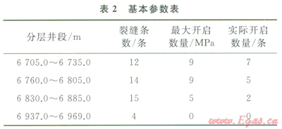 從圖l中看出,壓裂改造井段6695.5~6983m。總跨度287.5m,共有天然裂縫46條,裂縫傾角基本分布范圍為l5°~85°,其中6830m以深以低角度縫為主,6800m以淺以高角度縫相對較多,由于跨度較大,難以實現(xiàn)一次性壓裂,因此,根據(jù)儲層物性及天然裂縫發(fā)育情況采用分層壓裂方式。