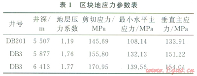 對大北區(qū)塊3口井的目的層實際取心進行觀察,并利用FMI成像測井資料對取心井的目的層天然裂縫發(fā)育情況進行了統(tǒng)計分析,結合鉆井地漏試驗,對區(qū)塊地應力進行研究及分析結果見表1。并求得壓裂層段的楊氏模量為32000~35000MPa,泊松比為0.22~0.24,水平應力差為20~30MPa。