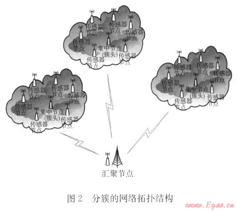 為了滿(mǎn)足管網(wǎng)監(jiān)測(cè)應(yīng)用網(wǎng)絡(luò)的設(shè)計(jì)需求,并考慮IEEE802.15.4標(biāo)準(zhǔn)(包括用于低速無(wú)線(xiàn)個(gè)人域網(wǎng)(LR-WPAN)的物理層和媒體接入控制層兩個(gè)規(guī)范)和ZigBee規(guī)范在網(wǎng)絡(luò)實(shí)現(xiàn)方面的支持,提出了面向管網(wǎng)監(jiān)測(cè)應(yīng)用的多層次分簇的無(wú)線(xiàn)傳感網(wǎng)絡(luò)架構(gòu),如圖2所示。為提高網(wǎng)絡(luò)的可擴(kuò)展性,同時(shí)降低網(wǎng)絡(luò)管理的復(fù)雜度,采用分簇的網(wǎng)絡(luò)結(jié)構(gòu)設(shè)計(jì),即將監(jiān)測(cè)網(wǎng)絡(luò)劃分為若干個(gè)簇,每個(gè)簇由一個(gè)簇首和若干個(gè)簇內(nèi)成員組成;低一級(jí)的簇首是高一級(jí)簇的簇內(nèi)成員,簇內(nèi)成員只與簇首節(jié)點(diǎn)進(jìn)行直接的通信,而簇首節(jié)點(diǎn)則負(fù)責(zé)數(shù)據(jù)在更大范圍內(nèi)的路由與轉(zhuǎn)發(fā);最高層的簇首為集中節(jié)點(diǎn)與匯聚節(jié)點(diǎn)直接通訊。