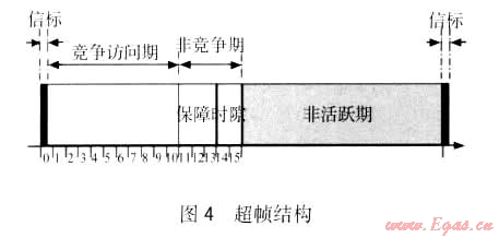 在IEEE802.15.4 MAC協(xié)議定義了超幀結(jié)構(gòu),如圖4所示。在幀群中存在兩個(gè)部分:活躍期與不活躍期(休眠期),在活躍期開(kāi)放信道接入,休眠期關(guān)閉信道,進(jìn)入休眠狀態(tài)以減少能耗。