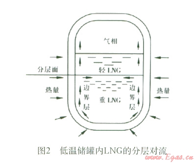 渦旋主要是由于在向盛有LNG的低溫儲罐中充注新的LNG液體或者LNG中氮蒸發(fā)而使儲罐內(nèi)的液體發(fā)生分層。分層液體在儲罐周邊漏熱的作用下,形成各自獨立的自然對流循環(huán),進而使各層液體的密度不斷發(fā)生變化,見圖2。當(dāng)相鄰兩層液體的密度近似相等時,兩個液層就會發(fā)生強烈混合,下層積聚的熱量突然釋放出來,同時伴隨著LNG表面蒸發(fā)率的驟增,幾乎可達到正常情況下蒸發(fā)率的250倍。蒸發(fā)產(chǎn)生的大量氣體,引起儲罐內(nèi)壓力突然增大,導(dǎo)致大量天然氣排空,造成嚴(yán)重浪費,甚至可能毀壞儲罐及工藝系統(tǒng),引起爆炸或火災(zāi),嚴(yán)重威脅人員和財產(chǎn)安全。