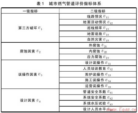 在城市燃?xì)夤艿里L(fēng)險(xiǎn)評(píng)價(jià)中,造成管道失效和事故的原因共有4類,即第三方破壞、腐蝕、誤操作和設(shè)計(jì)。通過各指標(biāo)的相互關(guān)系及隸屬關(guān)系對(duì)燃?xì)夤艿朗У臉?gòu)成要素進(jìn)行全面地分析,構(gòu)建如表1所示的二層綜合評(píng)價(jià)指標(biāo)體系。