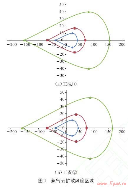 2,用時(shí)分別為27s和1162.3s,低于該熱流值時(shí)人員不會(huì)死亡、木質(zhì)結(jié)構(gòu)不會(huì)損壞。為此,危險(xiǎn)輻射強(qiáng)度取15.77kW/m2,兩種工況下噴射火的危險(xiǎn)半徑分別為45m和50m。