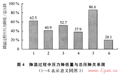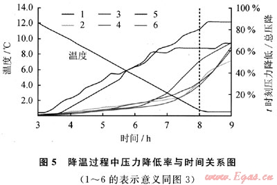考慮到介質(zhì)內(nèi)水合物在溫度下降過(guò)程中成核并生長(zhǎng),因此考察降溫過(guò)程中介質(zhì)內(nèi)壓力變化與時(shí)間的關(guān)系有助于進(jìn)一步了解水合物在介質(zhì)內(nèi)的形成機(jī)理。計(jì)算溫度由12℃降至0.5℃過(guò)程中不同時(shí)刻氣體壓力降低量占總反應(yīng)過(guò)程壓降百分比,并作圖5。