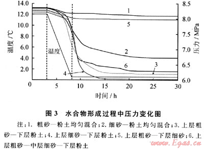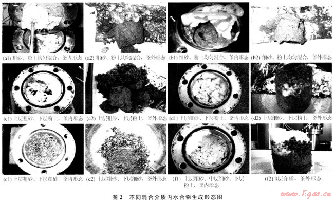 上述各組實(shí)驗(yàn)內(nèi)的水量均為100g,介質(zhì)類(lèi)型不同引起其內(nèi)水合物最終生成形態(tài)差異明顯,說(shuō)明介質(zhì)內(nèi)的水分分布狀態(tài)對(duì)水合物生成形態(tài)影響明顯。均勻混合介質(zhì)中摻入粉土的粗砂、細(xì)砂顆粒較粗,等質(zhì)量混合后對(duì)粉土持水作用影響不明顯,實(shí)驗(yàn)中甲烷氣體從反應(yīng)釜上部充入,介質(zhì)上界面水分與氣體接觸充分,水合物形成于介質(zhì)上界面,因而均勻混合介質(zhì)內(nèi)水合物最終生成相態(tài)基本類(lèi)似(圖2中a、b)。層狀介質(zhì)類(lèi)型可明顯影響其內(nèi)水合物生成形態(tài),原因可能是不同單一介質(zhì)對(duì)水分產(chǎn)生的吸持力差別大(粉土>細(xì)砂>粗砂),介質(zhì)搭配為層狀結(jié)構(gòu)后,水分在層狀介質(zhì)內(nèi)的分布狀態(tài)及水分子在介質(zhì)表面的吸附排列存在較大差異,因此層狀介質(zhì)內(nèi)水合物初級(jí)結(jié)構(gòu)生成順序明顯不同,水合物最終生成形態(tài)也就存在較大差異。粗砂、細(xì)砂層狀介質(zhì)內(nèi)實(shí)驗(yàn)前的水含量較高,介質(zhì)持水能力較弱,水合物類(lèi)似在過(guò)飽和介質(zhì)內(nèi)形成,形成較困難。另外,這些差異也反映出多孔介質(zhì)內(nèi)水合物形成機(jī)制非常復(fù)雜,此方面還需要做大量深入研究。