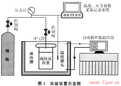如圖1所示,實(shí)驗(yàn)裝置由供氣、反應(yīng)和數(shù)據(jù)采集3系統(tǒng)組成。供氣系統(tǒng)由儲(chǔ)氣鋼瓶組成,其內(nèi)盛有純度99.99%的甲烷氣體;反應(yīng)系統(tǒng)由液浴槽(內(nèi)盛酒精冷卻液)、溫度探頭(-20~30℃±0.05℃)、高壓反應(yīng)釜及自動(dòng)循環(huán)低溫冷浴(自動(dòng)控溫,-10~50℃±0.05℃)組成;數(shù)據(jù)采集系統(tǒng)采集整個(gè)實(shí)驗(yàn)過(guò)程的溫度、壓力數(shù)據(jù),時(shí)間間隔1min。