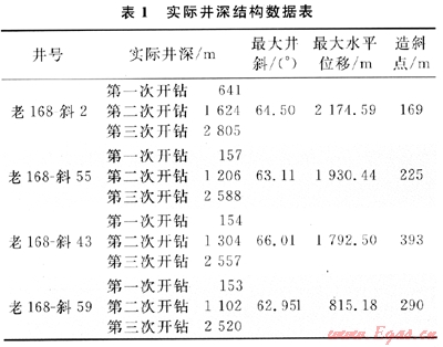 所采取的具體措施:①該叢式井組第一次開鉆采用老漿開鉆,小循環(huán)鉆進,向鉆井液中不斷補充天然高分子強抑制性包被絮凝劑(IND-30)及高分子包被絮凝劑(ZH-O2),利用高分子聚合物的絮凝作用及聚合物間的交聯(lián),協(xié)同能力提高鉆井液的抑制能力;②對于淺地層(平原組)大井眼定向的井(如老168-斜55、老168-斜43、老168-斜59井),當井斜達到30°左右時及時混入原油,并根據(jù)進尺情況加以補充,以提供足夠的潤滑性來降低摩阻及扭矩;③鉆進過程中保持足夠的排量(≥55L/s),充分清洗井眼攜帶巖屑;④鉆完第一次開鉆井深,用前井回收的老漿并加入2%的白油封裸眼井段,確保表層套管的順利下入。
