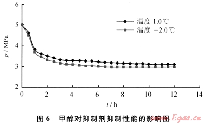 配制甲醇在純水溶液中的濃度為20%,抑制劑濃度為1.5%,體系壓力恒定在5.0MPa,測定時體系壓力、時間的變化關系如圖6所示。