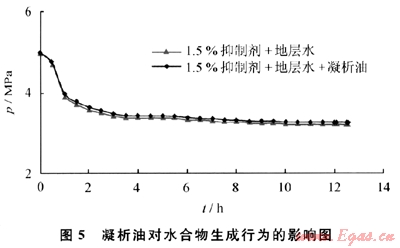 實驗初始溫度為20.0℃,在抑制劑濃度為1.5%、礦化度為28000mg/L的地層水的體系加入微量凝析油,研究凝析油對抑制劑抑制性能的影響,其結果如圖5所示。