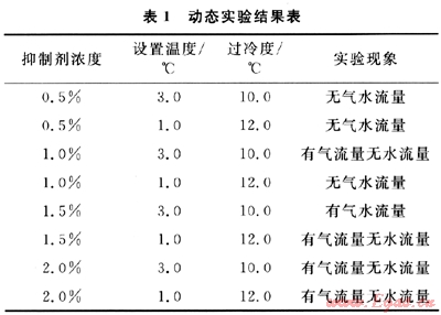 為了更好地模擬現(xiàn)場的真實情況,評價抑制劑的抑制性能,為現(xiàn)場提供正確指導,模擬井筒和長輸管線中的水合物堵塞情況,進行了不同過冷度、不同抑制劑濃度下的流動實驗,研究不同濃度的抑制劑的抑制效果。實驗共測定了4個濃度、2個過冷度下的水合物堵塞情況,其結果如表1所示。
