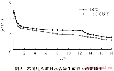 系統(tǒng)壓力分別為8.0MPa、7.0MPa、5.0MPa、3.0MPa時,抑制劑的有效抑制時間分別到9.0h、12.0h、12.5h、14.0h。系統(tǒng)壓力3.0MPa時,14.0h以后,無水合物生成,抑制效果明顯。在同一過冷度下,系統(tǒng)壓力越高,抑制劑抑制效果越差。