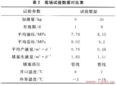 第二階段(加注新型抑制劑50kg)。除15日產(chǎn)液1.51m3,其余時間產(chǎn)液相對較少,且從12日起,溫度開始持續(xù)降低,15日堵塞當天最低溫度為-18℃,最高溫度也才6℃。分析認為,造成堵塞的原因為出液量突然增大使得抑制劑在產(chǎn)出液中的濃度降低,再加外界溫度很低,從而造成連續(xù)堵塞。即使如此本階段在加注新型抑制劑后,有效抑制期依然有9d,可見效果較好,其試驗數(shù)據(jù)對比結果如表2所示。