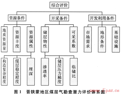 基于對晉陜蒙地區(qū)煤田地質(zhì)、煤層氣地質(zhì)資料及開發(fā)數(shù)據(jù)的分析,認(rèn)為影響本區(qū)煤層氣資源勘查潛力的因素主要有資源條件、開采條件、開發(fā)利用條件3個(gè)方面,具體評價(jià)指標(biāo)體系見圖1。