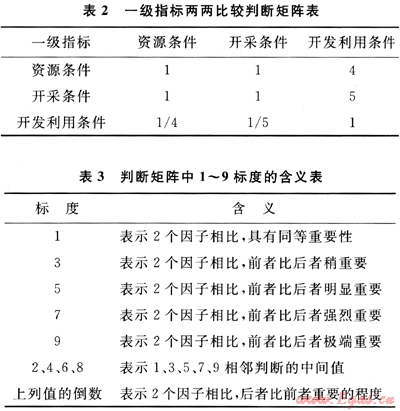 煤層氣勘查潛力指標(biāo)體系分為4層,其中目標(biāo)層為綜合評價(jià)值,準(zhǔn)則層有3層(分為三級指標(biāo))。下面以一級指標(biāo)權(quán)重計(jì)算為例,描述層次分析法確定權(quán)重的過程。專家討論后的打分結(jié)果見表2。專家打分時(shí)一般采用數(shù)字1~9及其倒數(shù)作為重要性標(biāo)度,其含義見表3,計(jì)算方法參見本文參考文獻(xiàn)[15]。
