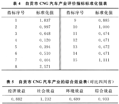 按上述評價模型,將2007年自貢市CNG汽車產(chǎn)業(yè)評價指標(biāo)標(biāo)準(zhǔn)化,其結(jié)果如表4。綜合效益計(jì)算結(jié)果見表5。