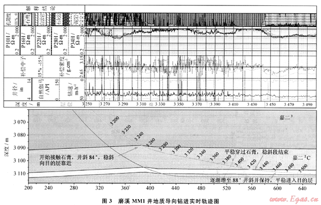 為避免鉆進(jìn)石膏層時發(fā)生卡鉆,設(shè)計開始以4°狗腿造斜并在3300m把井斜增加到84°,之后保持井斜向目的層接近,并以旋轉(zhuǎn)鉆進(jìn)的方式來通過目的層上方的石膏層。在3440m鉆速由4.8m/h增加到8.4m/h,密度由2.99g/cm3減小到2.84g/cm3,中子增加到5.4%,電阻率也由1000Ω·m下降到200Ω·m,用校正后的中子和密度交會得到孔隙度為6%~10%,巖性為白云巖。結(jié)合鄰井測井資料和區(qū)域地質(zhì)資料,通過地層對比地層,綜合判斷3440m已進(jìn)入目的層,其后井斜逐漸增至88°并保持穩(wěn)斜(圖3)。