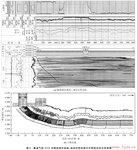 摘要:隨鉆地質(zhì)導(dǎo)向技術(shù)實現(xiàn)了以井下實際地質(zhì)特征來確定和控制井眼軌跡,達(dá)到了提高有效儲層鉆遇率的目的,對于高效開發(fā)復(fù)雜氣藏具有重要意義。為此,簡述了地震、測井聯(lián)合反演和三維可視化建模在地質(zhì)導(dǎo)向儲層預(yù)測中的作用,然后結(jié)合四川盆地中部磨溪?dú)馓颩M1水平井等多口井的產(chǎn)層導(dǎo)向鉆進(jìn)情況,總結(jié)出采用隨鉆測井(LWD)資料確定中靶點和鉆頭在目的層的位置,以及井眼軌跡、地層巖性剖面和隨鉆測井曲線綜合成圖與調(diào)整井眼軌跡等方法,并以此來指導(dǎo)磨溪?dú)馓锶B系嘉陵江組白云巖儲層的地質(zhì)導(dǎo)向鉆井施工,明顯提高了水平井目的層的鉆遇率和地質(zhì)導(dǎo)向鉆井的成功率,效果良好,值得推廣應(yīng)用。