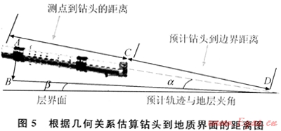由于靶體只有4m高,鉆進(jìn)過程容易鉆出目的層,為了優(yōu)化井眼軌跡,使鉆頭在目的層最有利位置鉆進(jìn)?,F(xiàn)場根據(jù)LWD儀器探測深度、傳感器到鉆頭距離、鉆頭到層界面距離關(guān)系來計算儀器鉆進(jìn)的最佳井斜角(圖5)[9]。其計算公式為: