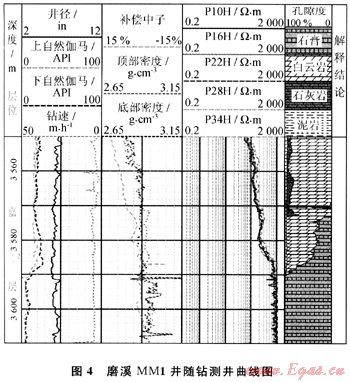 為調(diào)整鉆頭使其回到目的層,現(xiàn)場決定以7。狗腿減小井斜。經(jīng)過降斜到90°,鉆至3664m發(fā)現(xiàn)鉆速由3.8m/h增加到7.4m/h,密度由2.95g/cm3減小到2.80g/cm3,補(bǔ)償中子增加到7.7%,電阻率也由1800Ω·m降到200Ω·m,用校正后的中子和密度交會得到孔隙度為6%~10%,巖性為白云巖。表明儀器已經(jīng)由上部石膏層鉆回目的層。