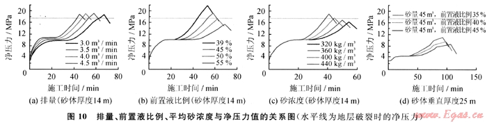 從圖10可以得出排量和平均砂濃度沒有前置液比例對縫內(nèi)凈壓力上漲的控制力度大,且25m垂直厚度的厚儲層凈壓力漲幅遠低于14m的薄儲層凈壓力的漲幅。按照凈壓力預(yù)測結(jié)果,以增加主裂縫縫長和控制次生裂縫產(chǎn)生為出發(fā)點,蘇5、桃7區(qū)塊水平井分段壓裂參數(shù)優(yōu)化范圍如下:排量3.5~4.0m3/min、薄砂體前置液比例45%~50%,厚砂體前置液比例43%~45%,平均砂濃度360~400kg/m3。