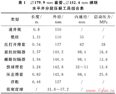 裸眼水平井分段壓裂需要的主要工具類型和參數(shù)見表1。按國際標準,投球滑套內(nèi)通徑采用6.3mm梯度,分段級數(shù)小于等于6級,采用3.175mm梯度,分段級數(shù)可達到10級[1]。