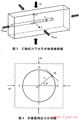 無限大地層水平鉆進后在井壁周圍會產(chǎn)生應(yīng)力集中[2~3],其物理模型如圖3所示,并假設(shè)井筒方向與水平最小主應(yīng)力方向平行。
