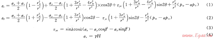 式中σr為徑向應(yīng)力,MPa;σy、σx分別為水平最大主應(yīng)力和最小主應(yīng)力,MPa;r為徑向距離,m;rw為井眼半徑,m;θ為井眼圓周上一點與水平面的夾角,(°);τyz為垂直于井筒yz平面的剪應(yīng)力,MPa;pw為井眼內(nèi)壓力,MPa;po為孔隙壓力,MPa;α為泊松比;γ為平均容重,kN/m3;H為地層深度,m;λ為井筒與垂直方向的夾角,(°);β為井筒與水平最大主應(yīng)力的夾角,(°)。
