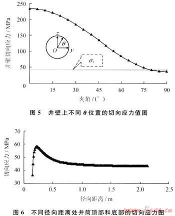 井壁圓周應(yīng)力分布如圖4所示,其中徑向應(yīng)力和切向應(yīng)力由式(1)、(2)和式(3)計算,垂向應(yīng)力由(4)式計算。