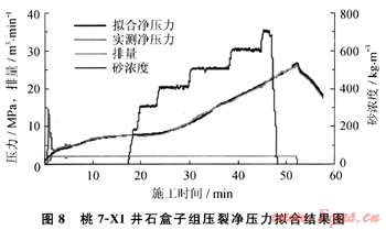 在待壓裂水平井壓裂參數(shù)設(shè)計前,先采用 FracproPT10.7軟件對鄰井已施工的同層位井壓裂曲線進行精確凈壓力擬合,以桃7-X1井壓裂施工曲線擬合為例,擬合結(jié)果如圖8所示,獲取區(qū)域地應(yīng)力參數(shù)和巖石力學(xué)參數(shù):泊松比為0.22,彈性模量為1.2×104MPa,產(chǎn)層閉合壓力梯度為0.0126MPa/m,產(chǎn)層閉合壓力為41.4MPa,泥巖閉合壓力為46.92MPa,產(chǎn)、隔層應(yīng)力差為5.5MPa,區(qū)域破裂壓力梯度為0.018MPa/m,區(qū)域地層破裂壓力為59.0MPa。