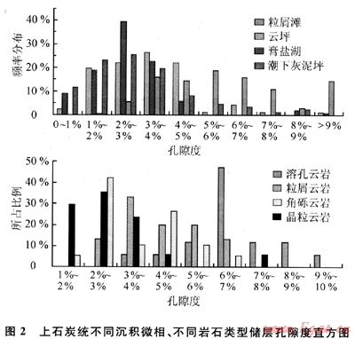沉積微相是有利儲(chǔ)層發(fā)育的基礎(chǔ)。從沉積作用的角度來看,川東石炭系主要發(fā)育潮坪沉積體系,主要的沉積微相是粒屑灘、云坪、潮下灰泥坪、與膏鹽湖等沉積微相[14~15]。根據(jù)對(duì)這些沉積微相的儲(chǔ)層孔隙度等的統(tǒng)計(jì),展示粒屑灘微相的白云巖儲(chǔ)層物性最好(圖2上),孔隙度區(qū)間多介于3%~9%,部分可超過9%,這是因?yàn)榱P紴┎粌H存在一定的原始沉積孔隙,為埋藏期儲(chǔ)層的白云化、溶蝕作用的發(fā)生創(chuàng)造了有利條件,而且使溶蝕孔隙成為主要的儲(chǔ)集空間。其次是云坪微相,其孔隙度區(qū)間為1%~7%,也有部分超過9%;而潮下灰泥坪與膏鹽湖微相的儲(chǔ)層孔隙度多低于4%,只有少量為4%~9%。因此,粒屑灘沉積微相最有利儲(chǔ)層的形成,并對(duì)儲(chǔ)層的后期改善起到重要促進(jìn)作用。