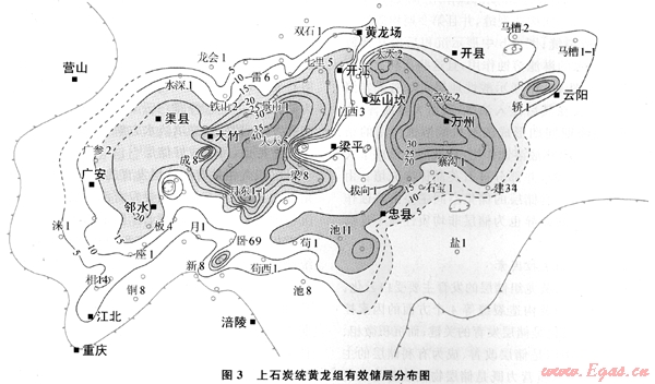 川東石炭系儲(chǔ)層分布廣泛,有效儲(chǔ)層多在黃龍組地層厚度大于10m的石炭系分布區(qū)[17~18]。有利的白云巖儲(chǔ)層(孔隙度大于3%)主要發(fā)育于開江古隆起的兩側(cè)地區(qū),厚度可達(dá)40m(圖3);在石炭系發(fā)育較薄的西南、東南與東北部地區(qū),白云巖儲(chǔ)層多小于10m;在西北部龍會(huì)達(dá)州地區(qū),石炭系的地層厚度雖然較厚,但是主要發(fā)育石灰?guī)r,儲(chǔ)層基本不發(fā)育。