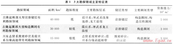 以上分析表明,四川盆地震旦系-下古生界具有有利的油氣成藏條件,資源潛力大,但勘探程度仍然很低,勘探前景廣闊。從勘探程度及研究、認識程度綜合分析,主要有3大勘探領(lǐng)域,即古隆起核部大型巖溶風化殼勘探領(lǐng)域、古隆起翼部大型構(gòu)造圈閉勘探領(lǐng)域和川東志留系致密砂巖及震旦系臺緣高能帶勘探領(lǐng)域,各領(lǐng)域的主要特征見表1。