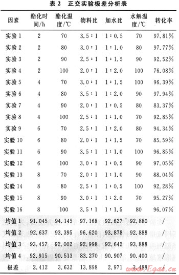 比較表2中各因素每個水平的平均值可以得到OPEM合成條件的最優(yōu)組合是酯化時問為6h,酯化溫度為70℃,物料比為3.5:1,加水比為1:1.0,水解溫度為90℃。比較各因素的極差大小可以看出,各工藝參數(shù)影響合成的強弱順序為:物料比、酯化溫度、水解溫度、加水量、酯化時間。