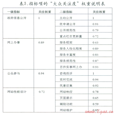 2)社會各階層很少注意的項目,例如監(jiān)督管理、在線受理、專題欄目等,雖然也十分重要,但其權(quán)重應(yīng)該與其他重點指標有差距,才能體現(xiàn)評估的公正性;
