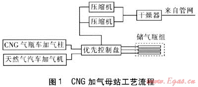 CNG加氣母站主要設(shè)備包括脫水裝置、壓縮機(jī)、優(yōu)先控制盤、儲(chǔ)氣瓶組、加氣柱、加氣機(jī),其他設(shè)備還包括進(jìn)站調(diào)壓計(jì)量裝置、空壓機(jī)等,有的加氣站還自備發(fā)電設(shè)備[3]。