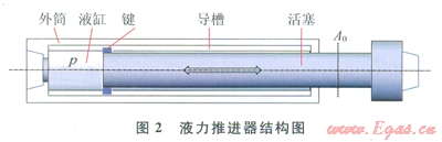 液力推進(jìn)器連接在下部鉆具內(nèi)。它是一個(gè)液缸活塞短節(jié)。圖2為液力推進(jìn)器結(jié)構(gòu)岡例。依靠液缸內(nèi)的液體壓力推動(dòng)活塞運(yùn)動(dòng),實(shí)現(xiàn)給鉆頭加壓。依靠外筒上的導(dǎo)槽與活塞端部的鍵來傳遞扭矩。
