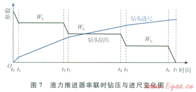 4)可以通過多個(gè)液力推進(jìn)器的串聯(lián),實(shí)現(xiàn)增加推進(jìn)行程和多鉆壓或選鉆壓鉆進(jìn)。圖7為3個(gè)液力推進(jìn)器串聯(lián)使用的鉆壓和進(jìn)尺變化圖。在當(dāng)前鉆井液排量、鉆頭噴嘴組合和下部鉆具組合的條件下,3個(gè)推進(jìn)器的工作鉆壓分別為Wt1、Wt2和Wt3。當(dāng)在t0時(shí)刻將鉆壓加滿額時(shí),3個(gè)推進(jìn)器都處在全縮進(jìn)狀態(tài),依靠鉆柱彈性鉆進(jìn)至t1時(shí)刻;在t1至t2時(shí)刻,第1個(gè)推進(jìn)器處于工作狀態(tài),其余2個(gè)處于全縮進(jìn)狀態(tài);在t3至t4時(shí)刻,第l個(gè)推進(jìn)器處于全伸出狀態(tài),其余2個(gè)處于全縮進(jìn)狀態(tài),依靠鉆柱彈性鉆進(jìn);在t3至t4時(shí)刻,第1個(gè)推進(jìn)器處于全伸出狀態(tài),第2個(gè)推進(jìn)器處于工作狀態(tài),第3個(gè)處于全縮進(jìn)狀態(tài);在t4至t5時(shí)刻,第l個(gè)和第2個(gè)推進(jìn)器處于全伸出狀態(tài),第3個(gè)處于全縮進(jìn)狀態(tài),依靠鉆柱彈性鉆進(jìn);在t5至t6時(shí)刻,第l個(gè)和第2個(gè)推進(jìn)器處于全伸出狀態(tài),第3個(gè)推進(jìn)器處于工作狀態(tài);在t6至t7時(shí)刻,3個(gè)推進(jìn)器都處于全伸出狀態(tài),依靠鉆柱彈性鉆進(jìn),直至鉆壓為零。在多個(gè)液力推進(jìn)器串聯(lián)時(shí),可以像圖7那樣讓所有的推進(jìn)器全部工作,也可以通過控制地面送鉆使其中的部分推進(jìn)器工作,不工作的推進(jìn)器處于全伸出狀態(tài)或全縮進(jìn)狀態(tài)。