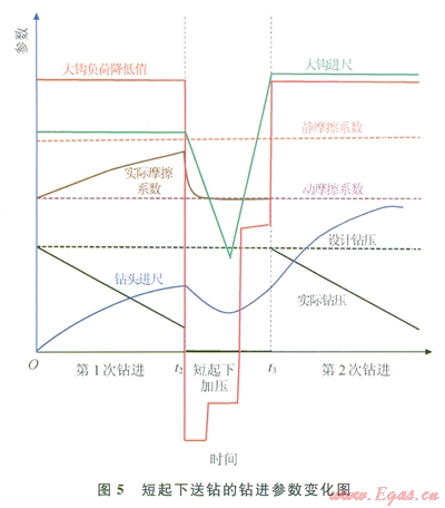 如何克服地面單向送鉆因摩擦力不確定帶來的鉆壓不確定的問題?用短起下送鉆方法(圖5),在鉆頭鉆壓較小時(shí)就上提鉆柱,將靜摩擦力克服掉,上提一段后,下放鉆柱,重新按照鉆壓控制參考表施加。這樣就可以減小施加到鉆頭上的鉆壓的誤差。