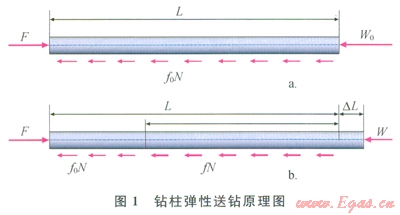對(duì)于沒有加液力推進(jìn)器或水力振蕩器的帶有井下動(dòng)力的鉆具組合,在送到井底并加上鉆壓后,地面就暫停送鉆。此時(shí),從地面看,鉆桿已經(jīng)停止運(yùn)動(dòng),那么鉆頭是否也已經(jīng)停止鉆進(jìn)?顯然不是,那么是什么在推動(dòng)鉆頭前進(jìn)?答案是鉆柱的彈性。鉆柱彈性送鉆原理如圖l所示。