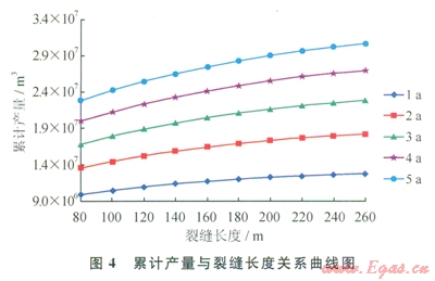 通過模擬不同縫網(wǎng)長度下的壓裂井產(chǎn)能,并分析凈現(xiàn)值與縫網(wǎng)長度的關(guān)系,其模擬結(jié)果如圖4、5所示。隨著裂縫長度的增加,累計(jì)產(chǎn)量與凈現(xiàn)值在200~220m均出現(xiàn)拐點(diǎn)。因此優(yōu)選的縫網(wǎng)長度為200~220m,此長度下地質(zhì)模型中的改造體積為128×104m3。