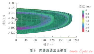 以優(yōu)化得到的高滲透帶長度、滲透率為目標(biāo),借助頁巖壓裂設(shè)計(jì)軟件對不同液量、不同砂量下的壓裂網(wǎng)絡(luò)裂縫參數(shù)進(jìn)行模擬。模擬發(fā)現(xiàn):改造體積與液量成正相關(guān)關(guān)系,縫網(wǎng)長度與前置液成正相關(guān)關(guān)系,它們均與砂量無關(guān),給定液量下裂縫導(dǎo)流能力與加砂量成正相關(guān)關(guān)系。最終在總液量為l600m3、總砂量為53m3下得到縫長202m,改造體積102×104m3 (其小于地質(zhì)模型中改造體積的原因在于模擬得到的裂縫網(wǎng)絡(luò)為橢球形,而地質(zhì)模型中的等效高滲透帶為長方體,后續(xù)研究中將對地質(zhì)模型進(jìn)一步改進(jìn)),縫網(wǎng)平均導(dǎo)流能力為0.039D·cm,平均縫網(wǎng)寬度為0.37mm,結(jié)合縫網(wǎng)參數(shù)計(jì)算得到等效滲透率為4.49mD,滿足設(shè)計(jì)要求。模擬得到的網(wǎng)絡(luò)裂縫參數(shù)如下:裂縫網(wǎng)絡(luò)長404m,裂縫網(wǎng)絡(luò)寬40m,裂縫網(wǎng)絡(luò)高92m,平均DFN寬度為0.37mm,改造體積(SRV)1025500m3,DFN體積為43lm3,DFN平均導(dǎo)流能力為0.0397D·cm,等效滲透率為4.49mD。網(wǎng)絡(luò)裂縫形態(tài)如圖8、9所示。