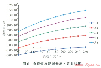 結(jié)合經(jīng)濟(jì)評價(jià)模型,通過模擬高滲透帶長度為80~260m下的產(chǎn)量,利用凈現(xiàn)值法優(yōu)選裂縫長度,凈現(xiàn)值表達(dá)式為: