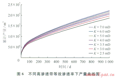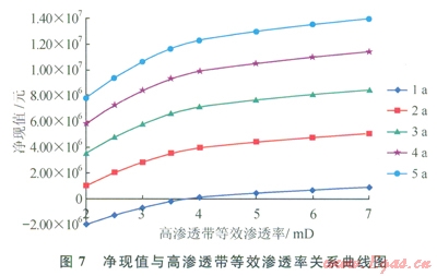 改變地質(zhì)模型中高滲透帶滲透率,模擬高滲透帶滲透率分別為2.5、3.0、3.5、4.0、5.0、6.0、7.0mD時(shí)的產(chǎn)量,分析凈現(xiàn)值與高滲透帶等效滲透率的關(guān)系,其模擬結(jié)果見圖6、7。隨著高滲透帶滲透率的增加產(chǎn)量不斷增加,當(dāng)高滲透帶等效滲透率增加到4mD后,產(chǎn)量增幅及凈現(xiàn)值曲線均趨于平穩(wěn),因此優(yōu)選的高滲透帶滲透率為4~5mD。