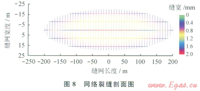 根據(jù)模擬結(jié)果推薦的施工參數(shù)為:總液量l600m3,總砂量53m3,平均砂比10%,最高砂比28%,施工排量10m3/min。