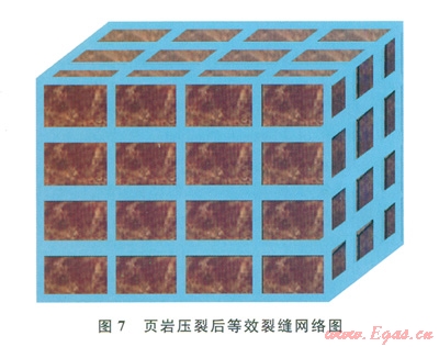 頁巖氣有效開發(fā)的前提就是頁巖儲(chǔ)層的大規(guī)模壓裂(體積壓裂),目的是形成復(fù)雜的裂縫網(wǎng)絡(luò),大大改善頁巖儲(chǔ)層的滲流能力。假設(shè)圖7所示的裂縫網(wǎng)絡(luò)等效整體壓裂后頁巖儲(chǔ)層的實(shí)際裂縫網(wǎng)絡(luò),壓裂裂縫寬度為w(m),小頁巖塊的長、寬、高均為a(m),則每個(gè)小頁巖塊的表面積為S=6a2(m2),每個(gè)頁巖塊所控制的裂縫體積約為V=3a2w.忽略井筒中殘留的壓裂液,則每個(gè)小頁巖塊吸水百分比為: