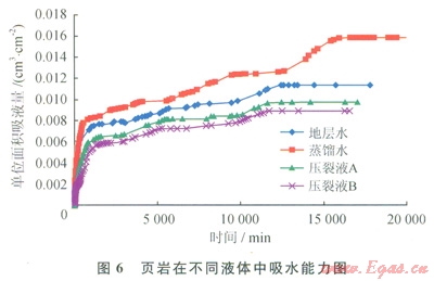 由于頁巖的吸水膨脹實(shí)驗(yàn)是在頁巖粉末壓實(shí)后的樣品上進(jìn)行的,因此它反映的是頁巖在不同液體中整體吸水的能力。而在實(shí)際地層情況下,頁巖是以致密巖石的形狀存在的,因此進(jìn)行頁巖儲(chǔ)層巖心吸水能力實(shí)驗(yàn)是研究頁巖儲(chǔ)層吸水能力的必要條件。