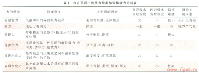 表1總結(jié)了水在頁巖中的受力種類及其返排情況。能返排出去的水主要為受毛細(xì)管壓力和重力影響的那部分水,與致密砂巖相比,頁巖的孔隙更小、黏土礦物更多,因此壓裂液返排率普遍都低于致密砂巖氣井。由氫鍵力、范德華力、滲透水化力以及表面水化力作用控制的那部分水很難返排,因此這部分水含量的多少直接決定了頁巖最終返排率的大小。